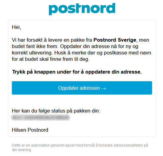 Mitt første møte med Postnord har vært slik: Jeg får en epost med beskjed om å verifisere at epostadressen er korrekt. Det er viktig, står det i eposten, at jeg bekrefter at e-postadressen er korrekt, siden Postnord sender varsler om sendinger på vei og sendinger som er klare til henting til deg per e-post. Bekreft din e-postadresse ved å følge lenken under/Bekreft din e-post ved å klikke her: Verifiser din e-postadresse. Så langt, så vel.