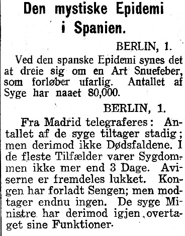 4. juni 1918 sto den første notisen om «den mystiska spanska sjukan» i svenske Dagens Nyheter, «den okända sjukdom som för ett par veckor sedan börjat härja i Madrid och som sedan med stor hastighet spritt sig vidare har enbart i Madrid krävt hundratusen offer och siffran stiger dagligen».