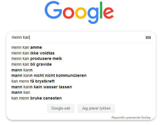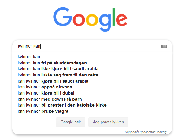 Disse forslagene gir ikke noe riktig bilde av hva folk søker etter. Alle søk med seksuelle undertoner er nå fjernet. Google gir deg muligheten til å rapportere upassende forslag (se lenken rett under «Jeg prøver lykken»).