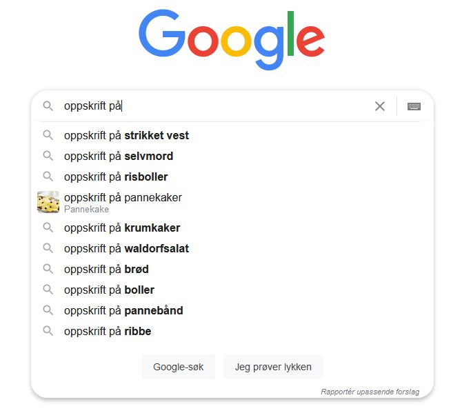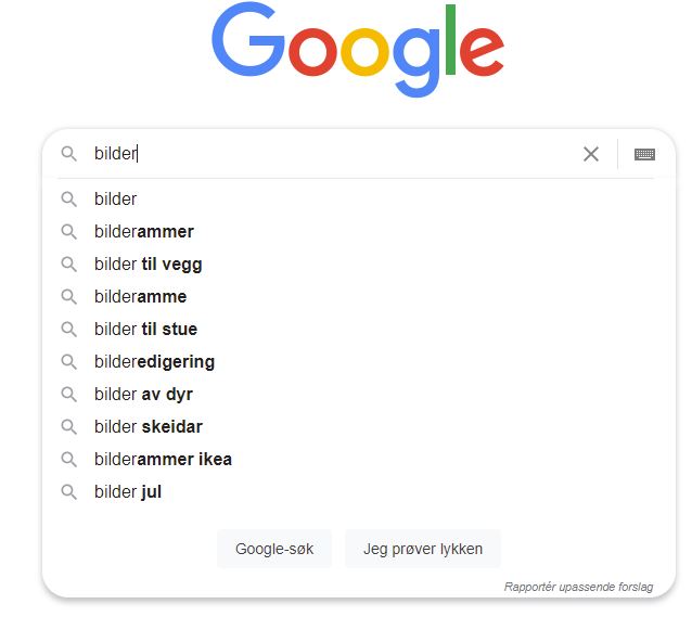 Som webredaktør med en lidenskap for synlighet i søkemotorer er jeg nok mer enn gjennomsnittlig interessert i søkemotorer og søkeresultater. Det søkemotorene forslår mens man skriver, er det verdt å se nøye på. Noen ganger kan det gi en pekepinn på innhold som bør skrives.