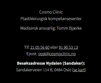 Noen klinikker har en praksis der de tar med medisinsk ansvarlig i alle annonser og eposter samt på bilder, men det er unødvendig, ifølge Helsetilsynet. Det holder at det er opplyst på klinikkens hjemmeside, for eksempel under Om oss eller Kontakt, eller liknende. En god løsning er etter mitt syn å ha det i footeren, for da er det tilgjengelig på alle sider. Slik kan det se ut i footeren: