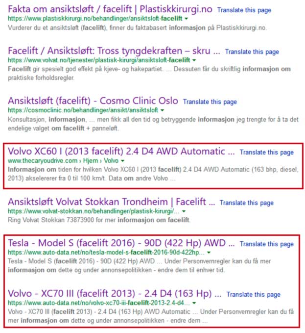 Bing skjønner ikke at et slikt søk dreier seg om operasjonen facelift (ansiktsløft), men tar med resultater fra bilverdenen også. I bilsammenheng brukes ordet facelift om modeller som er blitt endret/oppgradert. Hvis en bruker hadde vært interessert i bilmodellers facelift, ville hun ha foretatt søk av typen “Mercedes W212 facelift”, “Tesla facelift” osv.